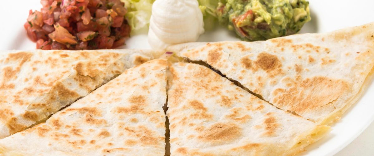 Quesadilla Zesty chicken or beef, cheese, cooked mixed peppers, filled into a tortilla and served with pico de gallo, sour cream and guacamole.